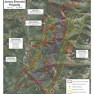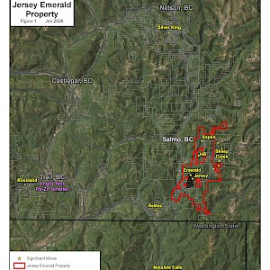 The Jersey Emerald property is located in southeastern British Columbia at latitude 49°06'N and longitude 117°13'W (NTS 82F/3), 10 kilometres southeast of the community of Salmo. The claims cover an area of approximately 17,500 hectares between the Salmo River on the west and the top of Nevada Mountain on the east, and are bounded by Hidden Creek on the north and the South Salmo River on the south. Year round gravel roads and power lines cross the property and water is plentiful. Underground workings of the historic Jersey and Dodger deposits are in excellent condition allowing for future underground access with little rehabilitation.